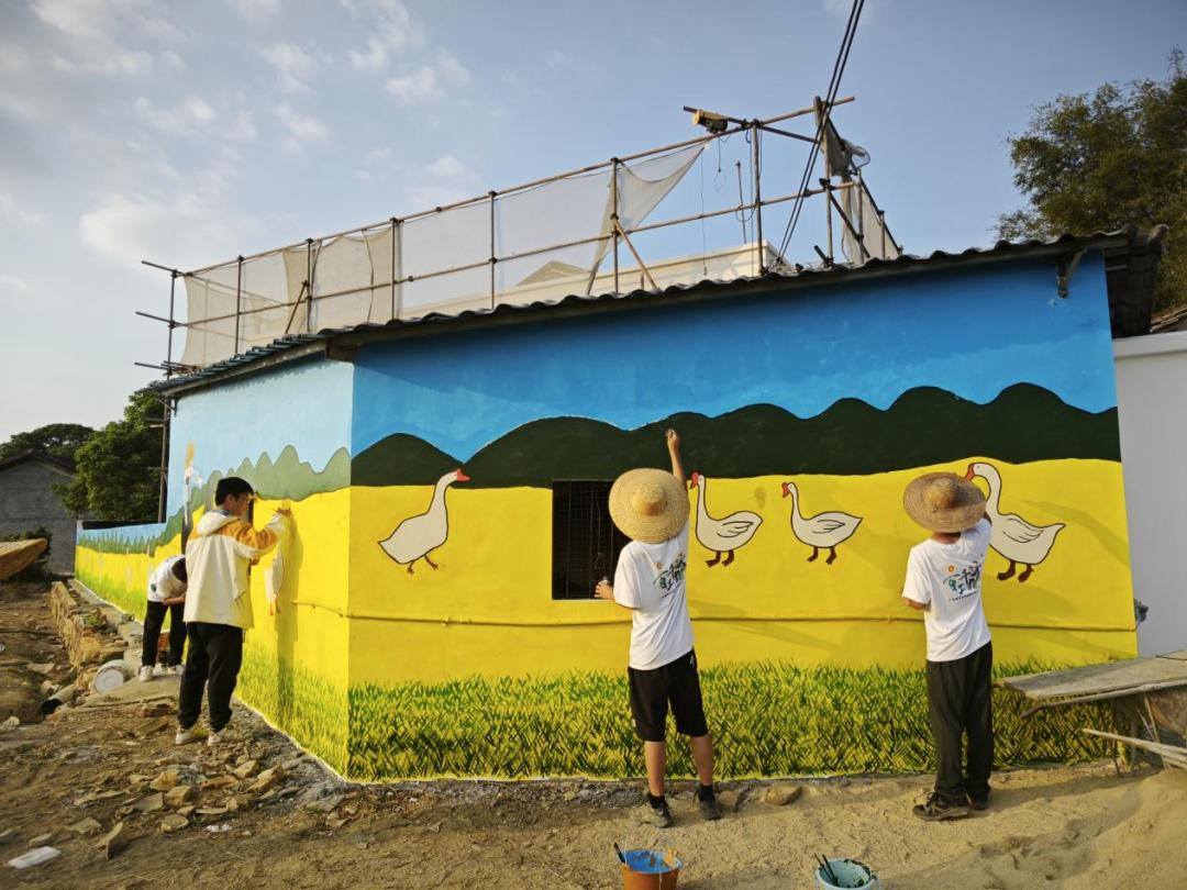 绘画结束后,师生们衣服被汗水浸湿,双手、鞋子等沾染了一层层颜料,俨然一幅“多彩青年”形象。“这次墙绘活动,不仅锻炼了大家的动手能力、提高专业实践水平,也为乡村振兴添砖加瓦,贡献了我们青年大学生的力量。”一位学子如是说道。