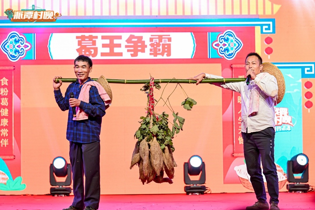 “相约拖罗乐‘村晚’,大擂台上赛‘葛王’”。小品《葛王争霸》上“重量级选手”悉数登场,5名拖罗村民手持5只不同特色的粉葛登台,纷纷对自己的粉葛侃侃而谈,有的说自己的粉葛貌若人参,有的说自己粉葛吃了有奇效,五花八门,最后评出的五个奖项更是逗得观众们哈哈大笑。