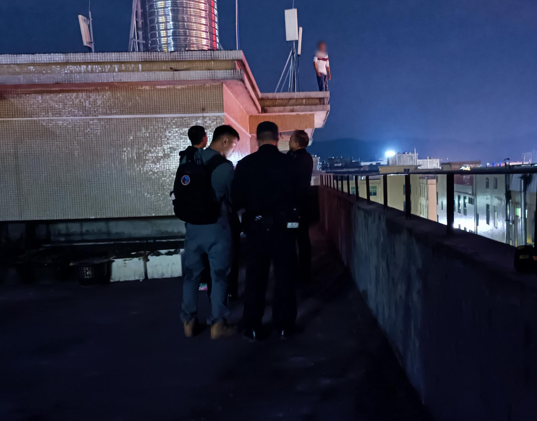 11月26日16时36分,狮岭派出所接群众报警称在狮岭镇阳光北路一楼顶上有一名男子欲跳楼轻生。接报后,狮岭派出所启动合成作战机制,值班领导立即带领数组警力赶赴现场处置,同时通过“花都慧眼”工程掌握了解现场周边情况,通知消防、医疗救援部门等,并提前制定救援方案。