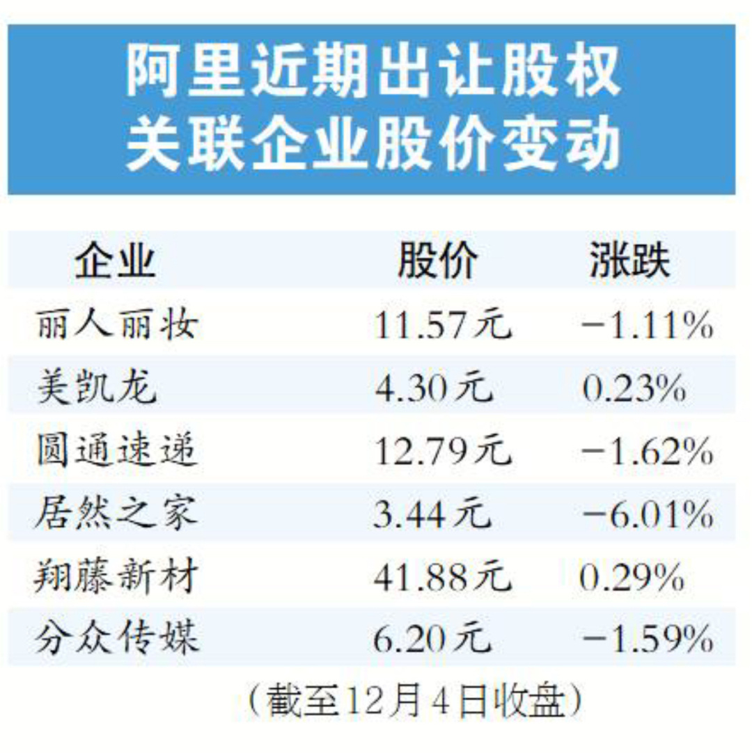 继12月1日,圆通速递、美凯龙、丽人丽妆先后发布权益变动报告书,宣布阿里巴巴(中国)网络技术有限公司(简称阿里网络)退出之后;12月3日晚,美年健康、分众传媒、千方科技和居然之家4家A股公司也同时宣布了相关变动。全媒体记者留意到,上述7家A股公司几乎都是同样的操作,即阿里网络将所持上市公司股份转交给转让给新设立的阿里系公司——杭州灏月企业管理有限公司(下称“杭州灏月”)。业内分析指出,“换手但不退出”成为最新7笔交易的关键词,此举或是阿里巴巴“1+6+N”组织变革后,改变投资布局,进一步收拢资金,聚焦做大主业的常规做法。截止12月4日港股收盘,阿里巴巴报70.800港元,跌-1.46%。
