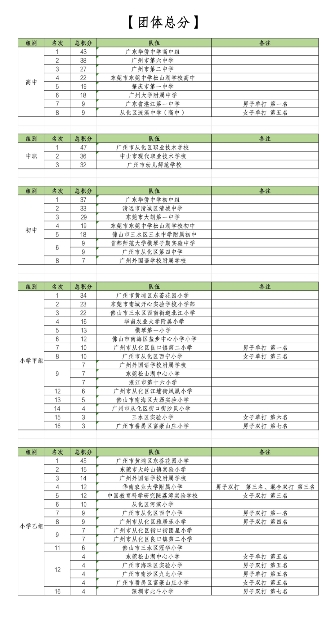 比赛在充满团结、奋进、友谊的热烈氛围中进行,分高中组、中职组、初中组、小学甲组和小学乙组5个组别,每个组别中再设男子单打、女子单打、男子双打、女子双打、混合双打项目,最终各小项的冠军名花有主,广东华侨中学包揽了高中和初中组的团体冠军,广州市黄埔区东荟花园小学囊括小学甲乙组的团体总分第一名,中职组的团体冠军归属于广州市从化区职业技术学院。