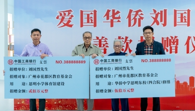 12月4日,广州市花都区花山镇思明小学收到爱国华侨刘国烈、邓倩桃夫妇250万元人民币的捐款。这笔捐赠的款项将主要用于思明小学体育馆建设和东校区(四合院)修缮使用。