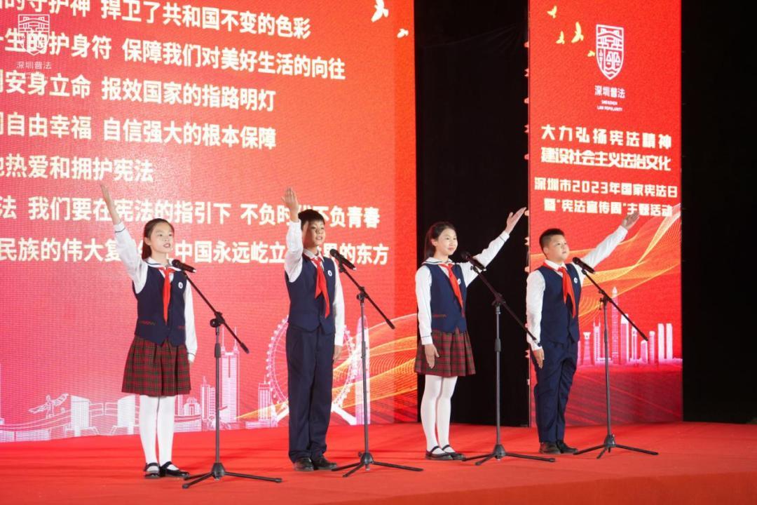 为引导青少年从小掌握宪法法律知识、树立宪法法律意识、养成尊法守法习惯,活动邀请来自福田区百花小学、东海实验小学、园岭外国语小学的四名优秀普法小使者,一起诵读了《宪法在我心中》,让青少年在朗诵中体会到宪法的庄严与神圣,真正让宪法的法律权威内化为青少年的衷心拥护和真诚信仰。