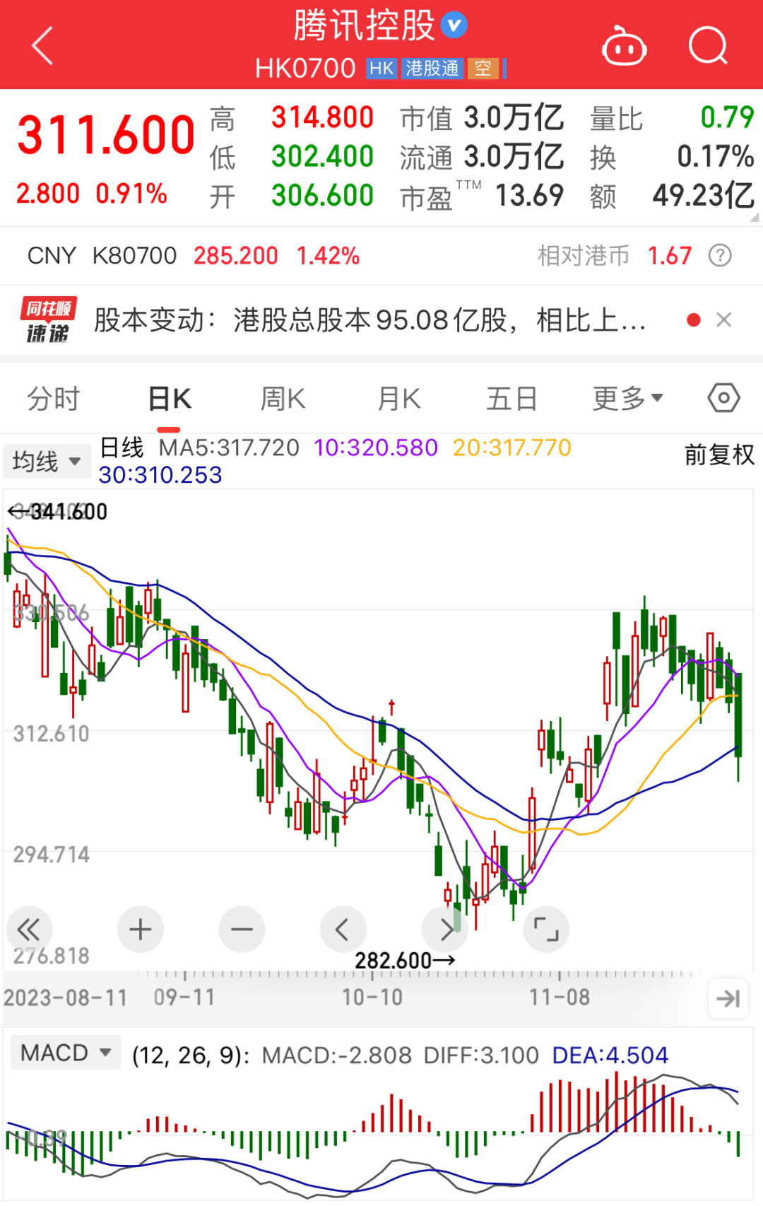 12月6日,腾讯控股在港交所公告,当日以每股302.8港元/股~314.8港元/股回购130万股股份,耗资约4亿港元。前一个交易日即12月5日,公告披露,腾讯控股以每股305.200港元~321.000港元的价格回购129.00万股,回购金额达4.01亿港元。