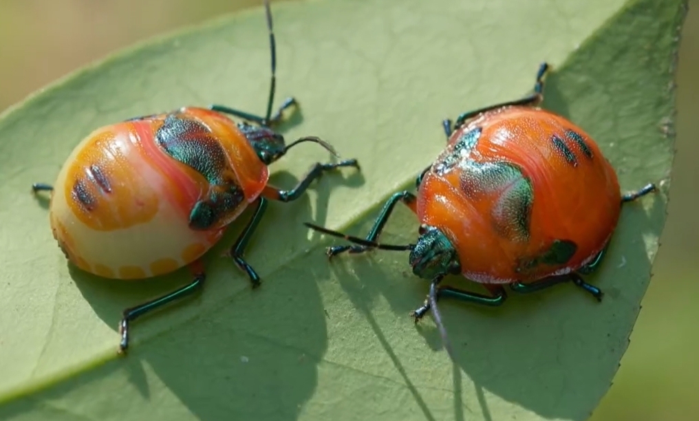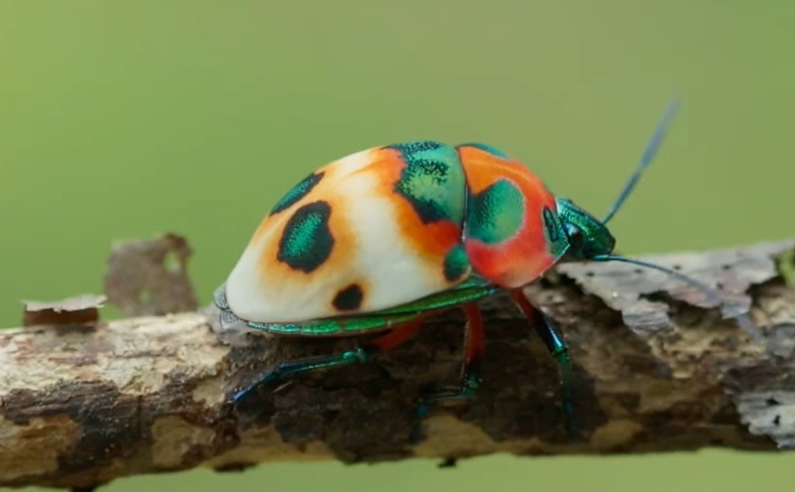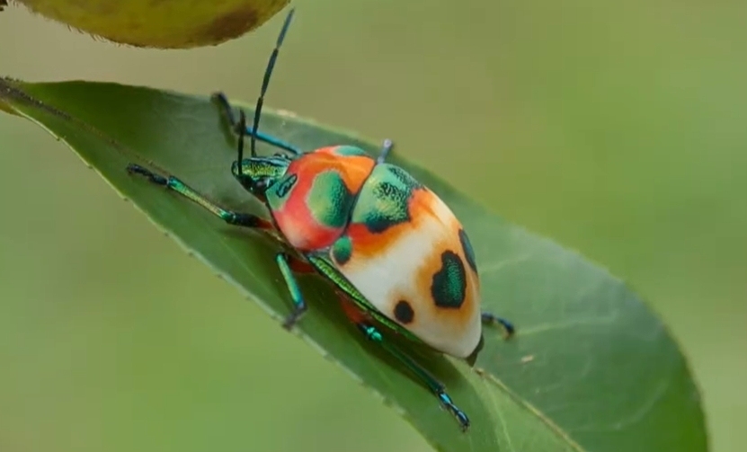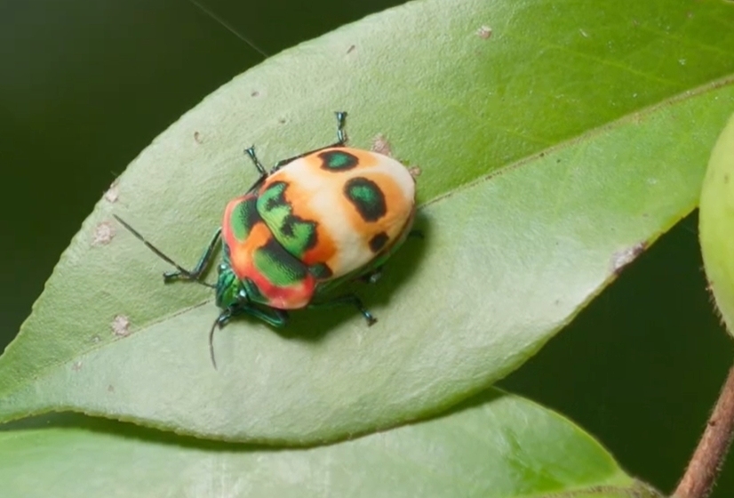 据华南国家植物园介绍,盾蝽科的动物会长得很漂亮,身体包括前翅,长得跟大家很喜爱的甲虫一样,一般人完全看不出它竟然是臭屁虫的一员。无论是幼年还是成年的油茶宽盾蝽,它们身体的颜色都十分丰富,呈现出与甲虫蝴蝶类似的结构色,即通过光线的反射、折射或干涉产生多种色彩,给人一种幻彩的感觉。