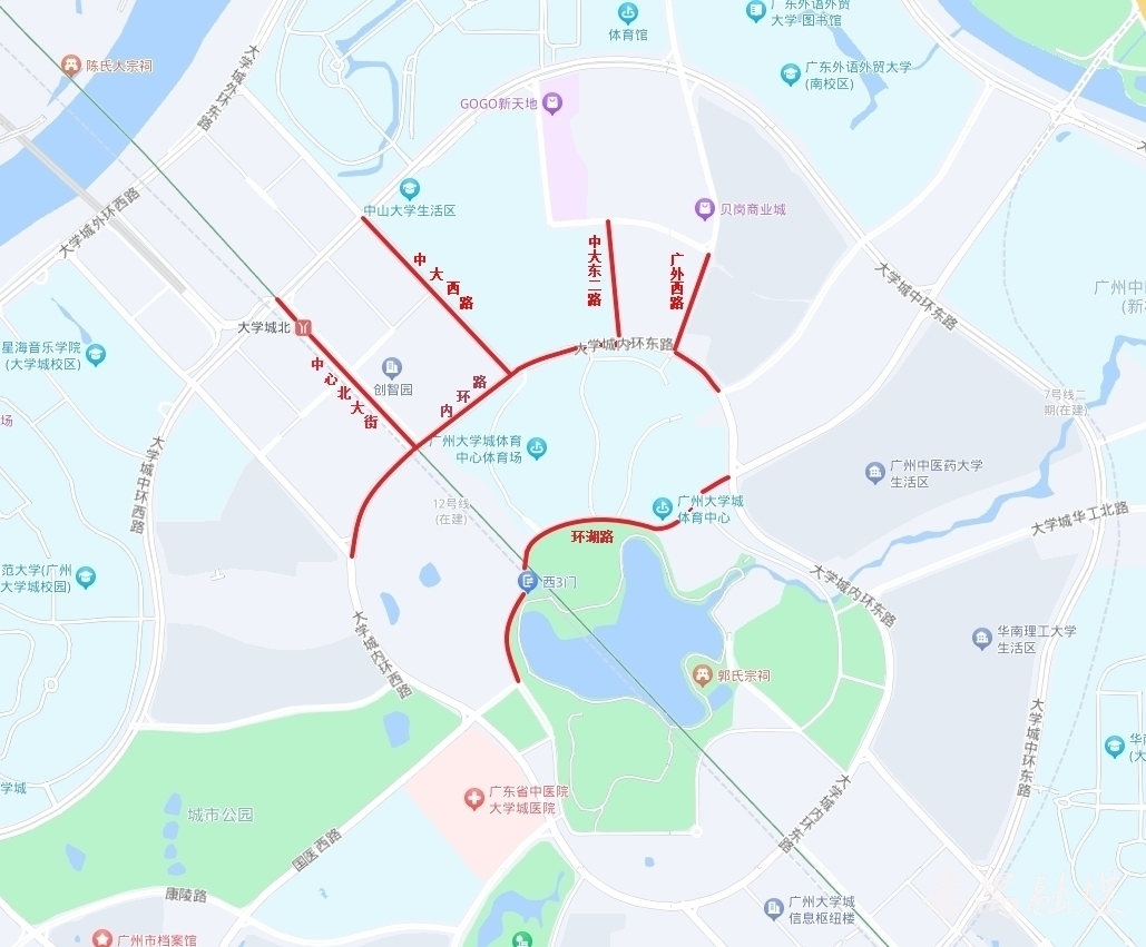 1.大学城内环路:星海东路口至广外东路口实施双向封闭,禁止停放社会车辆。