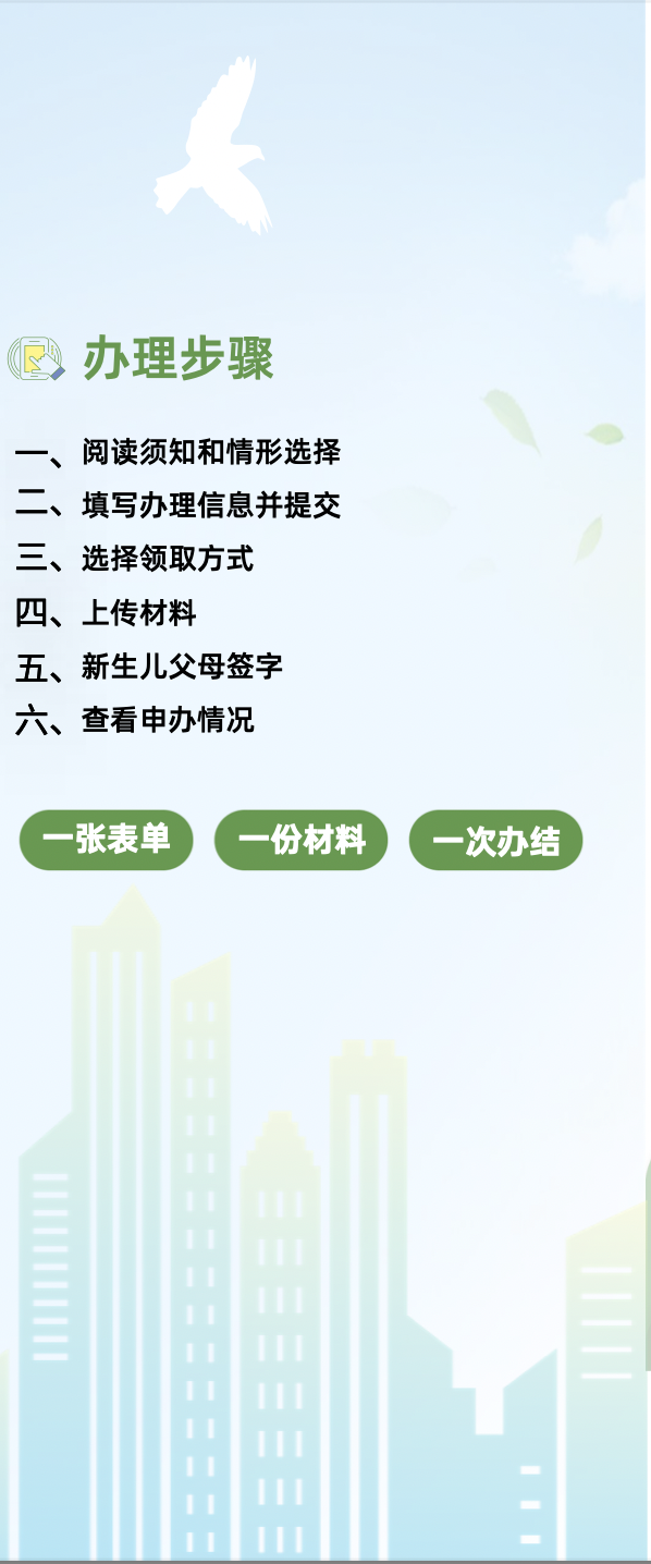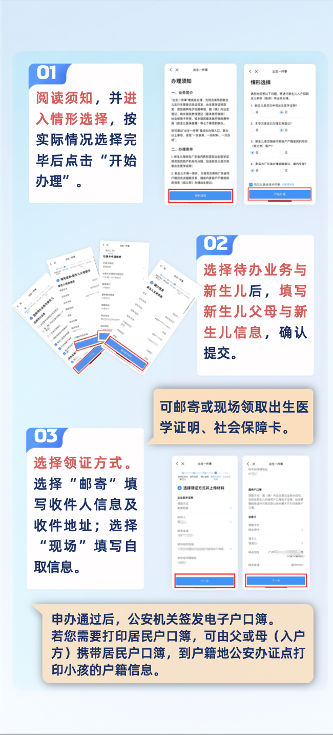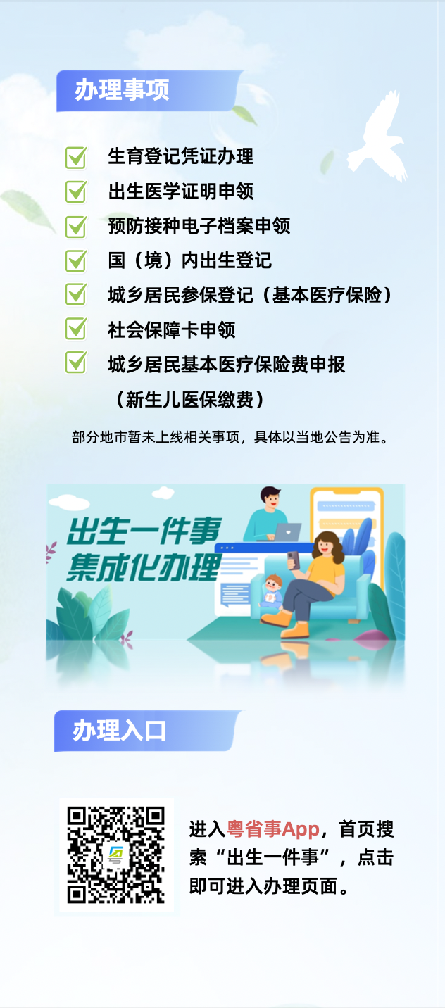与新生儿相关的7大事项实现“一站式”在线办理,具体包括:生育登记凭证办理、出生医学证明申领、预防接种电子档案申领、国(境)内出生登记、城乡居民参保登记(基本医疗保险)、社会保障卡申领和城乡居民基本医疗保险费申报(新生儿医保缴费)等。