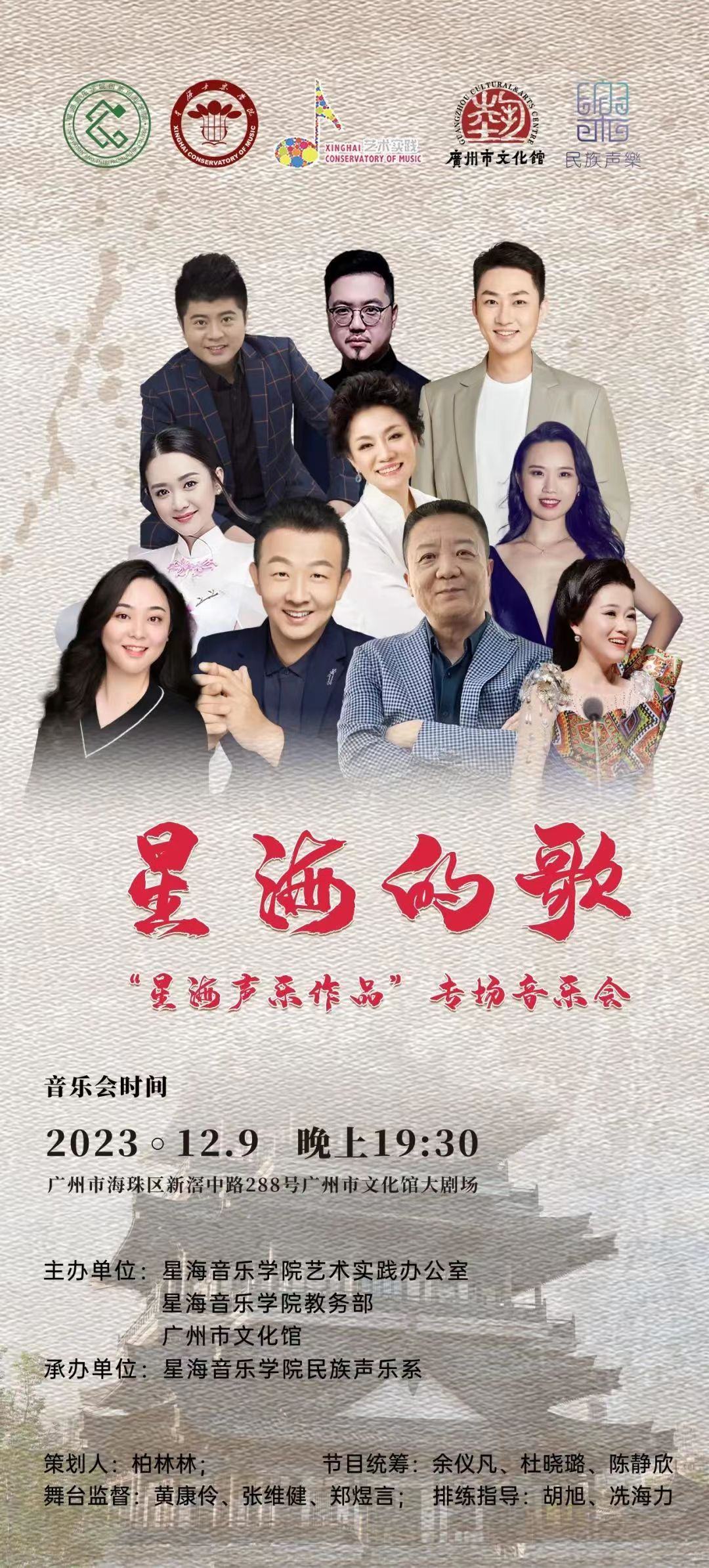 12月9日晚,由星海音乐学院艺术实践办公室、星海音乐学院教务部、广州市文化馆联合主办,星海音乐学院民族声乐系承办的《星海的歌》——“星海声乐作品”专场音乐会将在广州市文化馆大剧场开演。