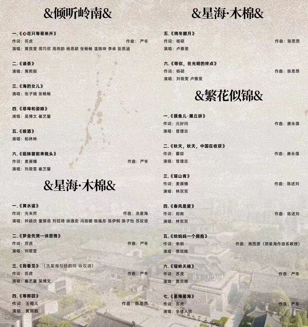 音乐会分为“倾听岭南”“星海·木棉”“繁花似锦”三个板块,以星海民族声乐系的优秀教师、优秀校友为演出团队,融入独唱、二重唱、小组唱等主要形式,出演近年来星海人创造的优秀作品,展现星海人的精神风貌。