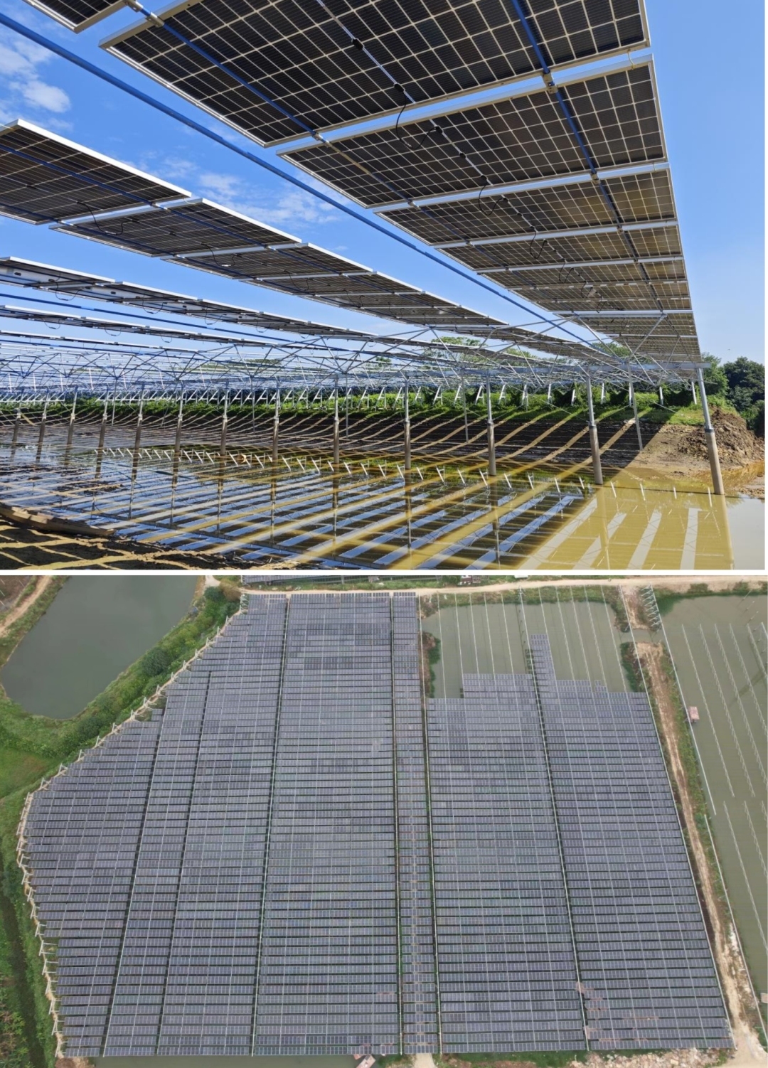 值得一提的是:该项目采用的45米大跨距柔性支架结构在区域内非常罕见,受制于本项目场地分散、各场地地质条件差距较大、鱼塘建设环境,结合属地渔业作业要求,在对比传统刚性支架下的密布桩基的基础结构形式,经过承建方团队多次论证,最终确定这一项目采用45米大跨距柔性支架结构,“以钢索作为组件支撑,具有跨度大、架空高地形适应能力强等优点,可以突破空间局限,更好的适应地形复杂、下部空间有种殖、养殖及生态要求等复杂应用场景,能更好地助力于土地综合复用,但跨距的增大也给施工提高了难度。”承建方称,大跨距柔性支架技术的运用,带来钢索水平压力增大、风振现象加剧和结构整体挠度控制难度增大等问题。为此,中冶武勘项目部充分发挥在核心业务岩土工程领域的综合优势,积极沟通,严格按照设计要求施工,针对场区的不同地质条件,采用不同的施工方案并做出有针对性的调整,用严谨的态度对待每一条施工程序,确保项目施工可行、质量可控;对于实际施工过程中遇到的问题,提出自己的建议与优化方法,让该项技术做到因地制宜,发挥最大的效能。