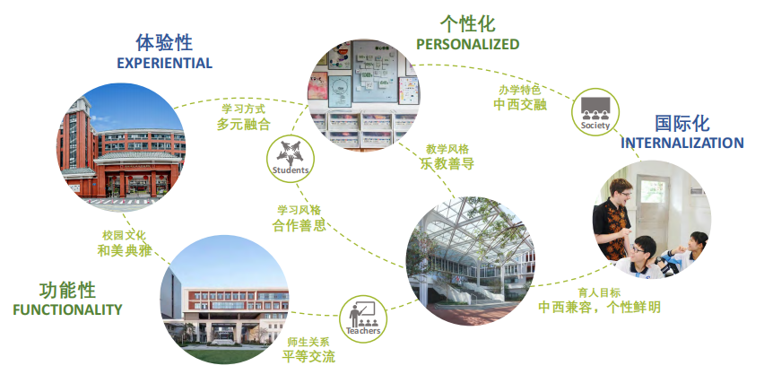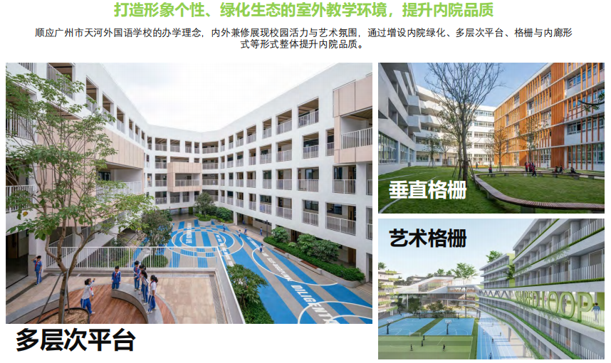 学校传承教育集团核心校广州市天河外国语学校目标及理念,结合现代技术科学创造富有生命力的校园空间体系。