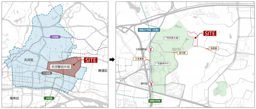 项目地块位于天河区东部,广州世界大观、广东奥体中心的北侧,周边的主要交通通道有奥体路、悦景路、大观南路,与地铁4号线黄村站相距约2千米,距地铁21号线(在建)大观路站约1.5千米。同时,项目地块位于天河智谷五个价值单元之一,属主导功能区内。