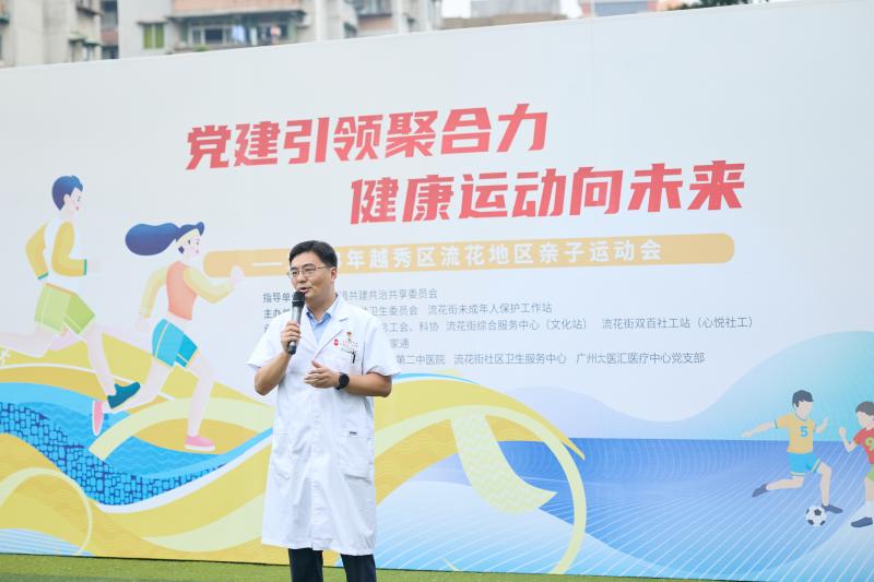 在亲子运动会现场,流花街设置了健康知识宣传摊位与义诊摊位。广东省第二中医院针灸康复科主任曾科学也应邀来到现场,结合“运动健康”主题,向居民科普“拉伸疗法”,并带领居民一起做健身动作,指导大家科学热身。
