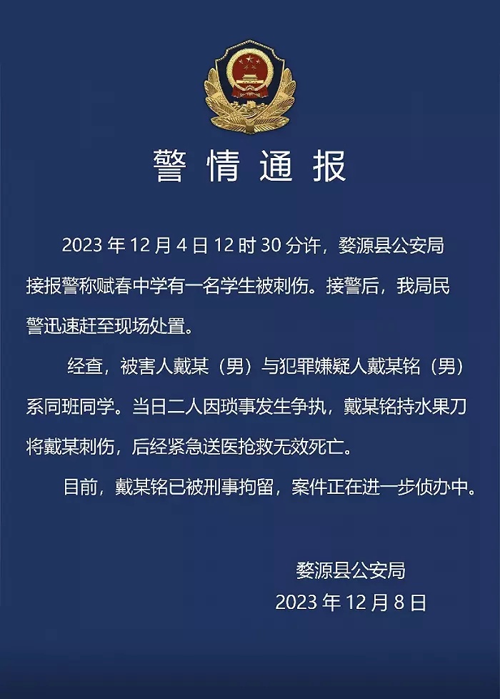 12月8日晚,江西婺源公安发布警情通报,12月4日12时30分许,婺源县公安局接报警称赋春中学有一名学生被刺伤。经查,被害人戴某(男)与犯罪嫌疑人戴某铭(男)系同班同学。当日二人因琐事发生争执,戴某铭持水果刀将戴某刺伤,后经紧急送医抢救无效死亡。目前,戴某铭已被刑事拘留,案件正在进一步侦办中。