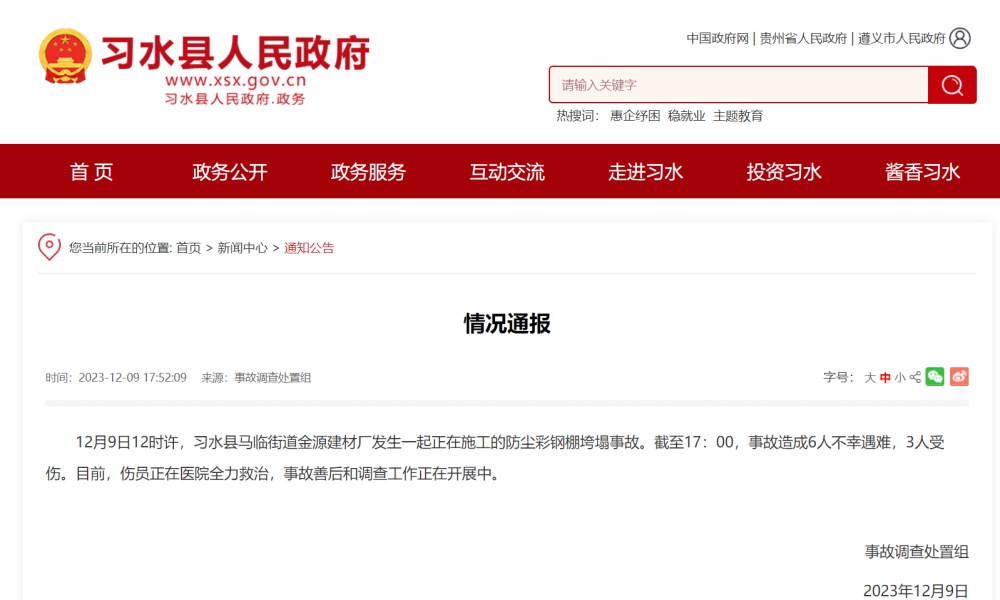 贵州习水县政府网站通报:12月9日12时许,习水县马临街道金源建材厂发生一起正在施工的防尘彩钢棚垮塌事故。截至17:00,事故造成6人不幸遇难,3人受伤。目前,伤员正在医院全力救治,事故善后和调查工作正在开展中。