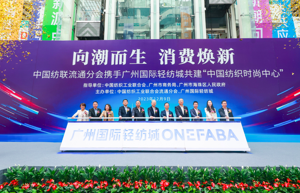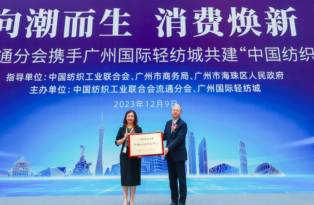 12月9日,向潮而生,消费焕新——中国纺联流通分会携手广州国际轻纺城共建“中国纺织时尚中心”活动在广州国际轻纺城举行。活动上,中国纺织工业联合会流通分会向广州国际轻纺城授予“中国纺织时尚中心”牌匾,标志着全国首个纺织时尚中心正式落户广州市海珠区。