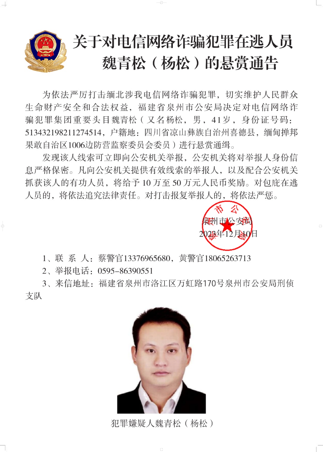 为依法严厉打击缅北涉我电信网络诈骗犯罪,切实维护人民群众生命财产安全和合法权益,辽宁省大连市公安局决定对白所成、白应苍(又名李云晨)、白应兰(又名李梦娜)进行公开悬赏通缉;福建省泉州市公安局决定对魏怀仁、魏榕(又名陈榕)、魏青松(又名杨松)进行公开悬赏通缉;福建省龙岩市公安局决定对刘正祥、刘积光(又名李华光)、刘正茂进行公开悬赏通缉;重庆市公安局决定对徐老发(又名徐发启)进行公开悬赏通缉。