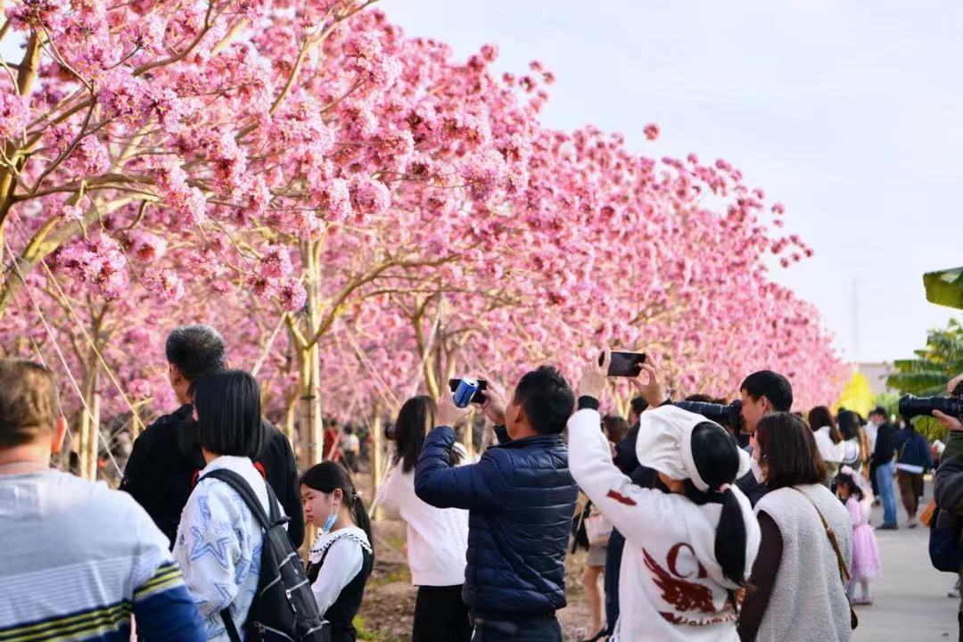 今年年初,马克村紫花风铃木亮相央视《新闻联播》,成为远近闻名的网红打卡地,10多天时间接待游客超10万人次。花田人气旺,也带旺了本地经济。马克村规划了花田旁的临时摊位,甘蔗、剑兰、柠檬等各色摊位一眼望不到头,游客赏完花沿路就能购买田间地头最新鲜的农产品。东涌镇利用好“花经济”的巨大潜力,统一规划临时摆卖摊位免费向农户开放,让人流量变成村民的“致富力量”。