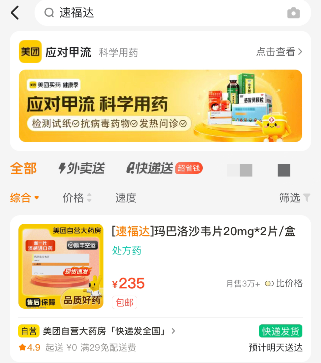 此前,美团买药在九个城市开通了“阿奇霉素全城找药”,让有需要的用户可以足不出户买到急需药品。12月7日,考虑到近期速福达、希舒美、达菲、可威等药物的市场需求仍在持续增长,美团买药启动顺丰空运达、现货极速发、品牌保正品、平台控稳价等四项措施,与相关药企深度密切合作以全力保障呼吸道疾病用药的平价供应。