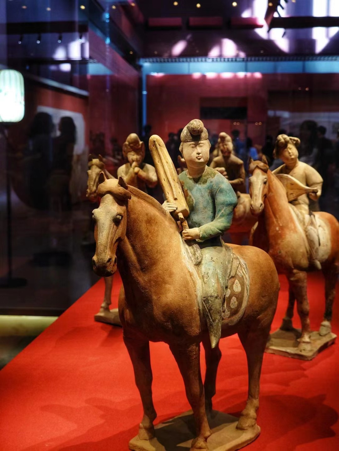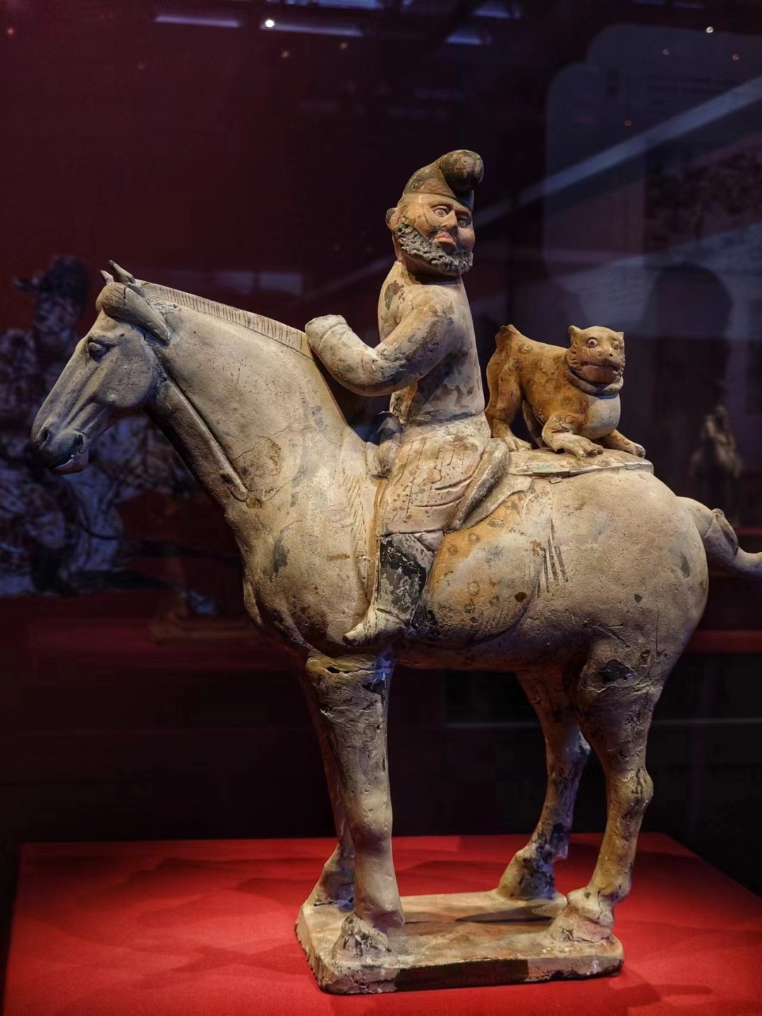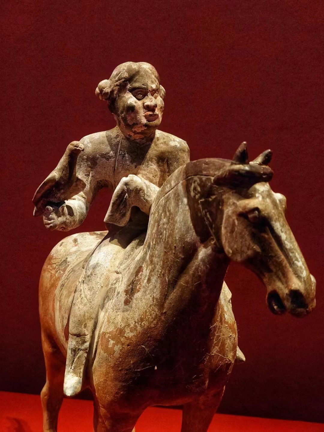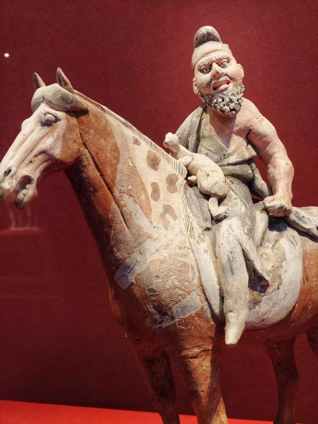 在金乡县主合葬墓中出土的彩绘狩猎骑马俑和牵驼、牵马俑中,大多是高鼻多须的胡人形象,骑马鼓吹仪仗俑和骑马伎乐俑手中多有筚篥、胡笳、琵琶、箜篌等胡乐乐器,从中可一窥盛唐时期中外交流的盛景。