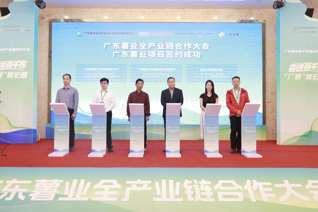 此外,广东薯业新动能还在不断涌现——共计5组项目在大会期间举行了现场签约。签约方涉及农业龙头企业、农科院所、媒体等多元主体,合作囊括薯业数据共建共享、科研试验、采购等多个领域。这意味着,广东薯业全生态链正形成紧密联合。
