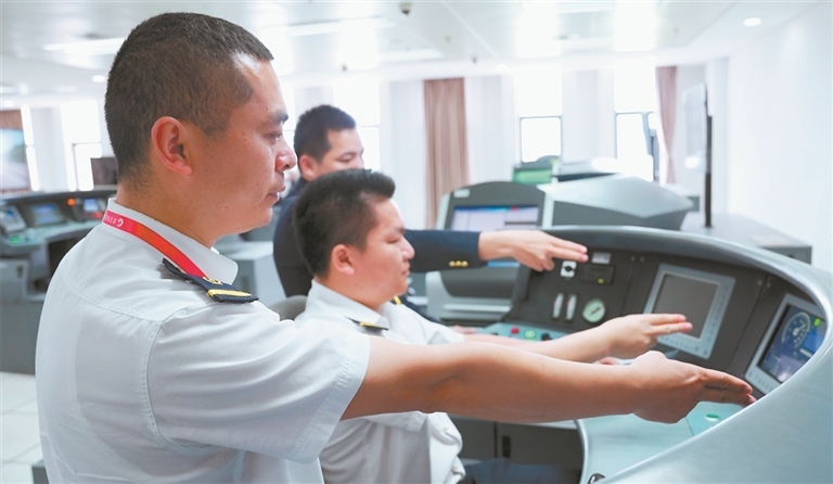在实训教学楼,记者近距离感受了国内培训功能最全的动车驾驶仿真器。培训师刘伟刚正在训练学员驾驶“380A型动车组”。记者看到,为确保真实感,仿真器操控台依照真实高铁操控台比例一比一制作。从前方投影仪上,学员可以看到前方和两旁的模拟画面。模拟画面中,站台、房屋及两边的风景等均高度还原现实场景。学员在驾驶中还能感觉到列车启动、停车以及拐弯时由惯性产生的摇晃感。