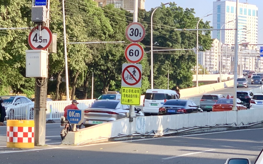 另外,在多座过江桥梁,同样竖立了电动自行车禁止通行的警示标志。在江湾大桥南面上桥位,除了有电动自行车禁行的图形标志,还有“禁止非机动车(含电动自行车)、行人通行。”的警示语句。