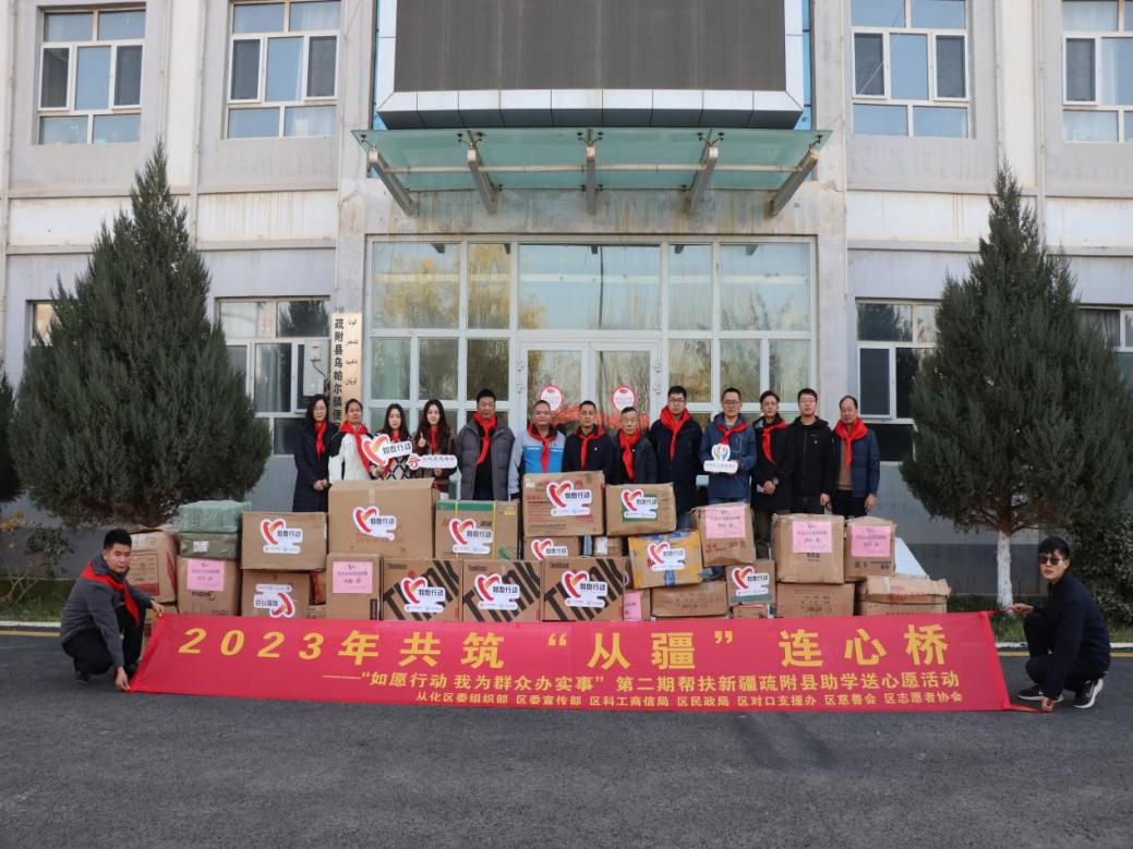 12月1日,广州市从化区科工商信局联合区对口支援办、区慈善会、区志愿者协会及有关单位开展对口援疆帮扶活动,在乌帕尔镇举行2023年共筑“从疆”连心桥——“如愿行动 我为群众办实事”第二期帮扶新疆疏附县助学送心愿活动捐赠仪式。