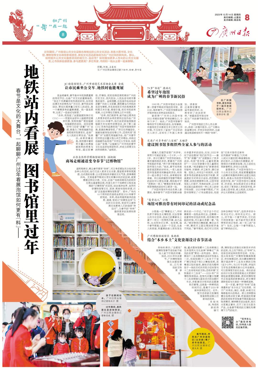 曾获得“广州市公共图书馆2021年度好读者”称号的康幼之,今年75岁了。她说,广州图书馆春节等传统节日期间的活动,如写春联、中国传统艺术展览及手工技艺工作坊等,不仅吸引了留在广州过年的大人孩子,还吸引了外国人来参加。读者在这里享受着四溢书香的同时,也感受到了浓浓的年味。“希望在图书馆过年成为广州的春节新民俗。”她说。