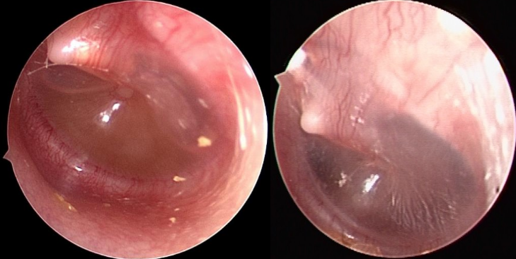 小许急性中耳炎合并耳后脓肿(左)鼓膜急性充血肿胀(右)