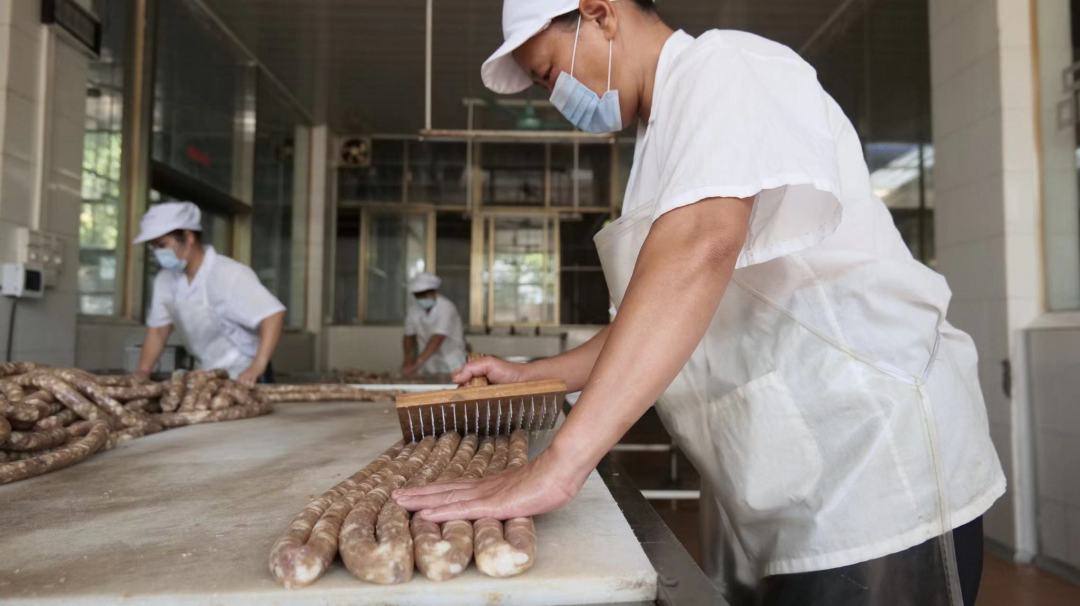 在张秋霞看来,做出好腊味的秘密“既简单又复杂”。“首先就是猪肉原料得新鲜,当天采买,所以在我们这里是没有冰箱的。”张秋霞说,其次就是坚持全手工制作,分割切粒、拌料腌制、漏斗灌肠、针板刺孔、扎草分段、索绳悬挂、清洗去脂、阳光晾晒、天然风干这九道工序都是手工完成。
