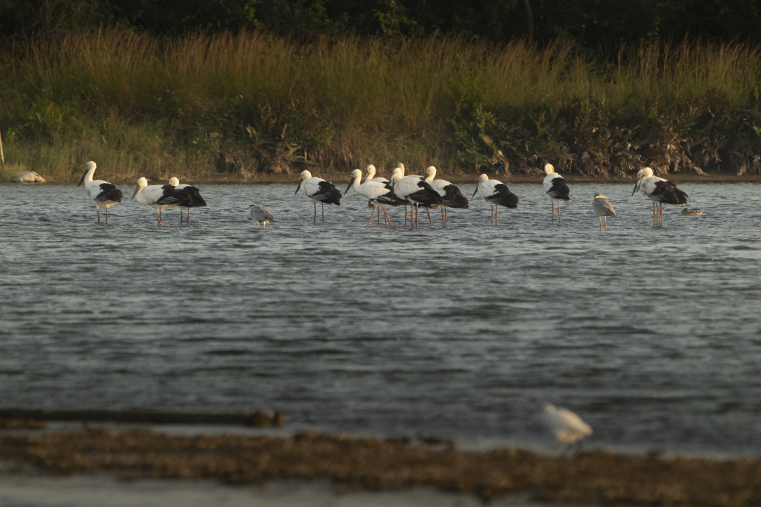 “当天就是日常去拍鸟,很幸运与东方白鹳‘偶遇’。”据茂名本土摄影爱好者陈汉钟回忆,11月底,他扛着摄影器材在电白海边观鸟时,突然一群与众不同的大鸟出现在他的视线范围之内。有着多年观鸟经验的陈汉钟在观鸟时立刻意识到这群大鸟的独特,随即摆好相机,用长焦镜头记录下了这一珍贵影像。