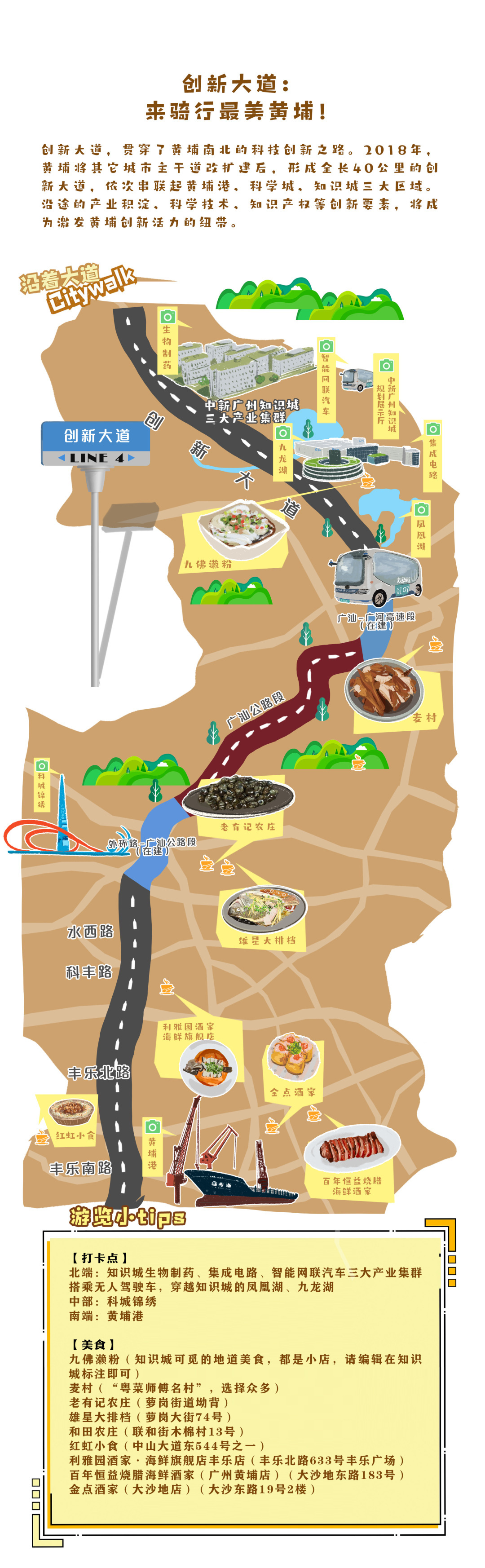 创新大道,贯穿了黄埔南北的科技创新之路,可以全程领略黄埔山水韵味和城市魅力。骑行创新大道,可以打卡沿途分布的大量科技创新园区和重点产业项目。从生物制药产业项目百济神州、诺诚健华、龙沙等,到集成电路产业粤芯半导体、深南电路等,再到智能网联与新能源汽车超级产业链群里的小鹏汽车、百度阿波罗等。创新大道众多创新企业、科研院所、高校智库、服务机构云集,成为全区创新要素流动的“风景线”。