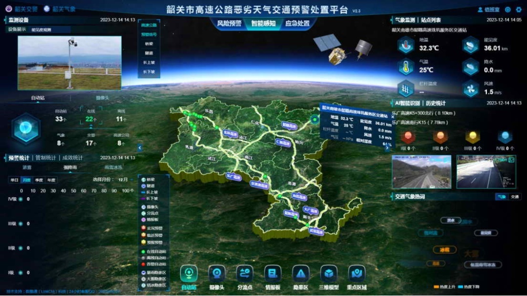 演练现场,京珠北高速因结冰封闭,抗冰保畅压力转移至乐广北高速,“高速公路恶劣天气交通预警处置平台”及“隧道运营安全智能监测系统”两项科技创新发挥了极大作用。