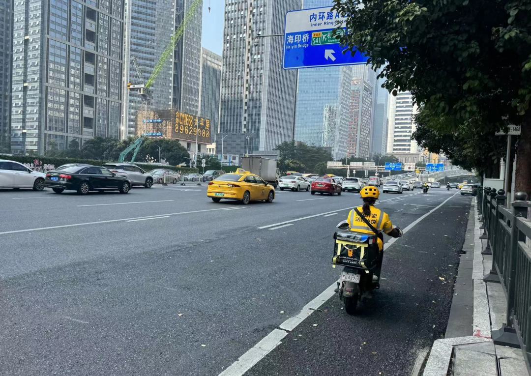 12月15日11时,已进入外卖配送的高峰期。记者来到黄埔大道西一处商圈附近,临近中午外卖员已经忙碌起来,在道路上快速行驶,穿梭在各个写字楼派单。