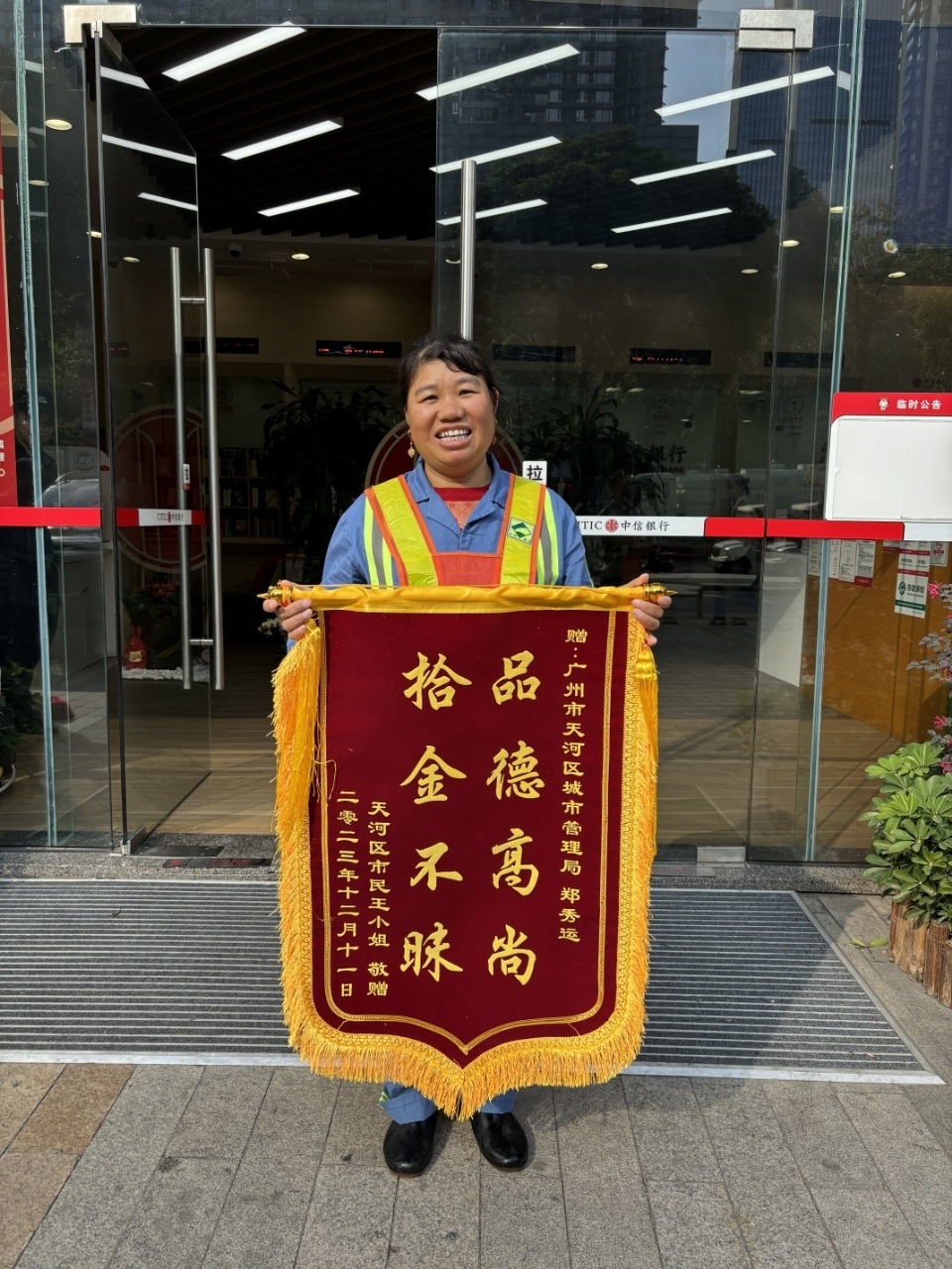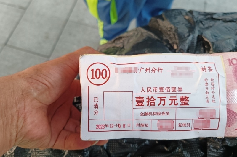 12月11日下午5时左右,广州市天河区城市管理第一保洁所(以下简称保洁一所)环卫工人郑秀运像往常一样在洗村路进行路面清扫作业,扫到花城大道中一家银行周边时,在地面停车场的两台车中间发现一摞物品,走近细看竟是一沓带有银行封签的人民币现金。
