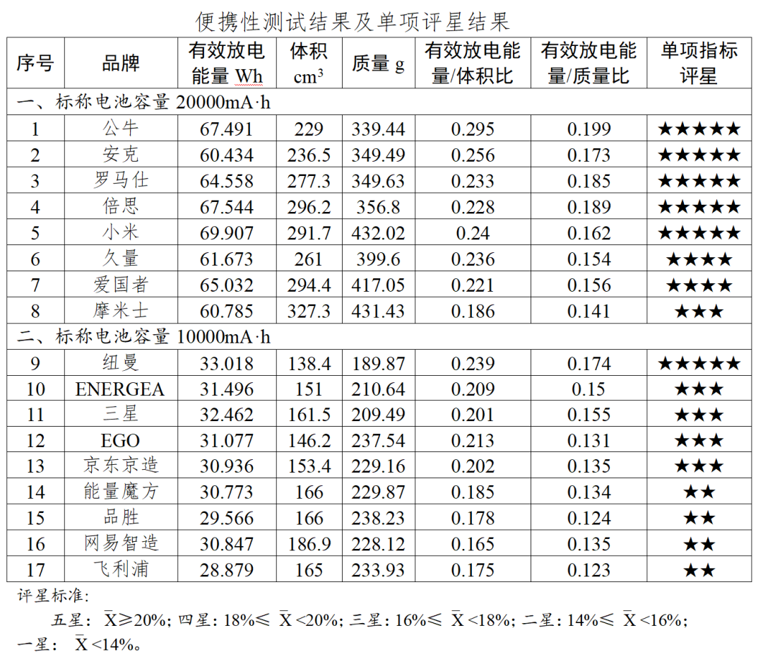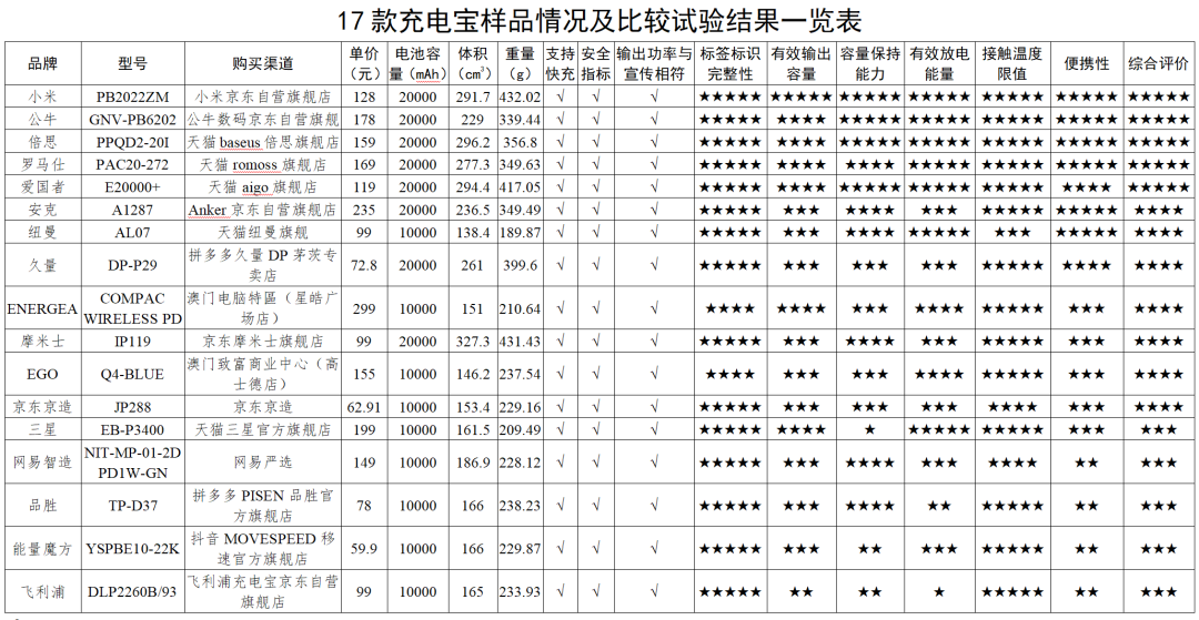 综合来看,5款样品总体表现优秀获评五星,分别为:小米、公牛、倍思、罗马仕、爱国者;7款样品总体表现良好,获评四星;5款样品总体表现一般,获评三星。