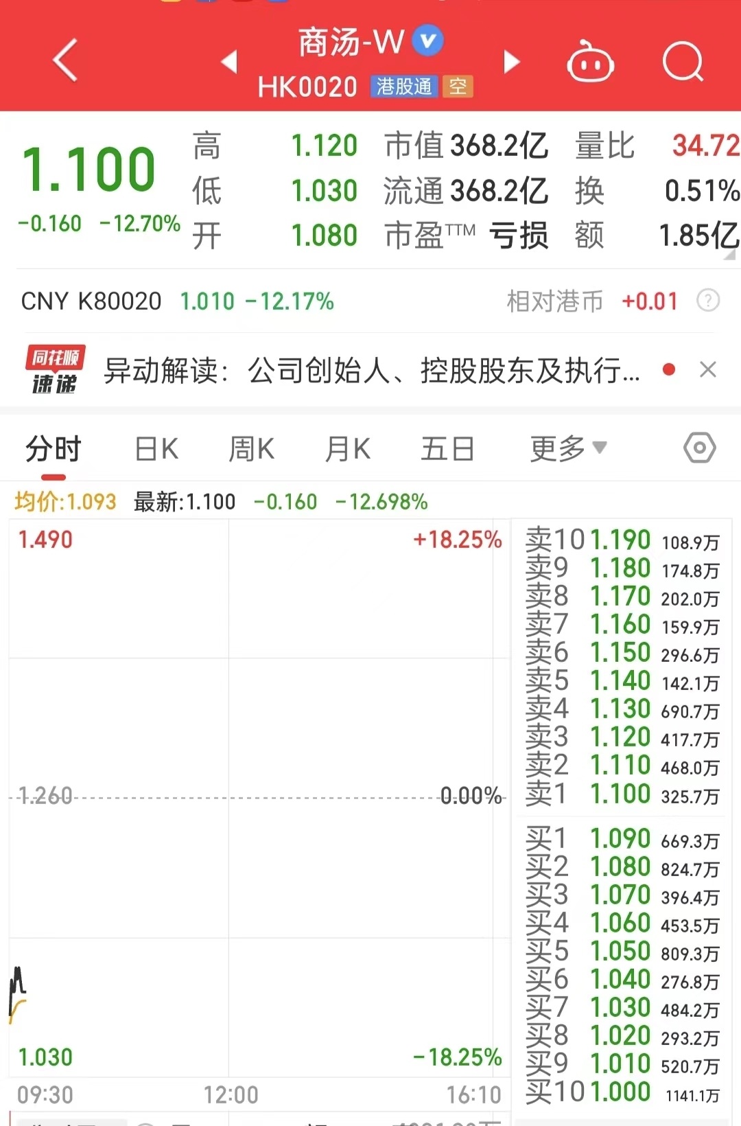 12月18日,港股商汤低开14.29%,截至发稿,该股跌幅收窄至12.7%,报1.11港元。