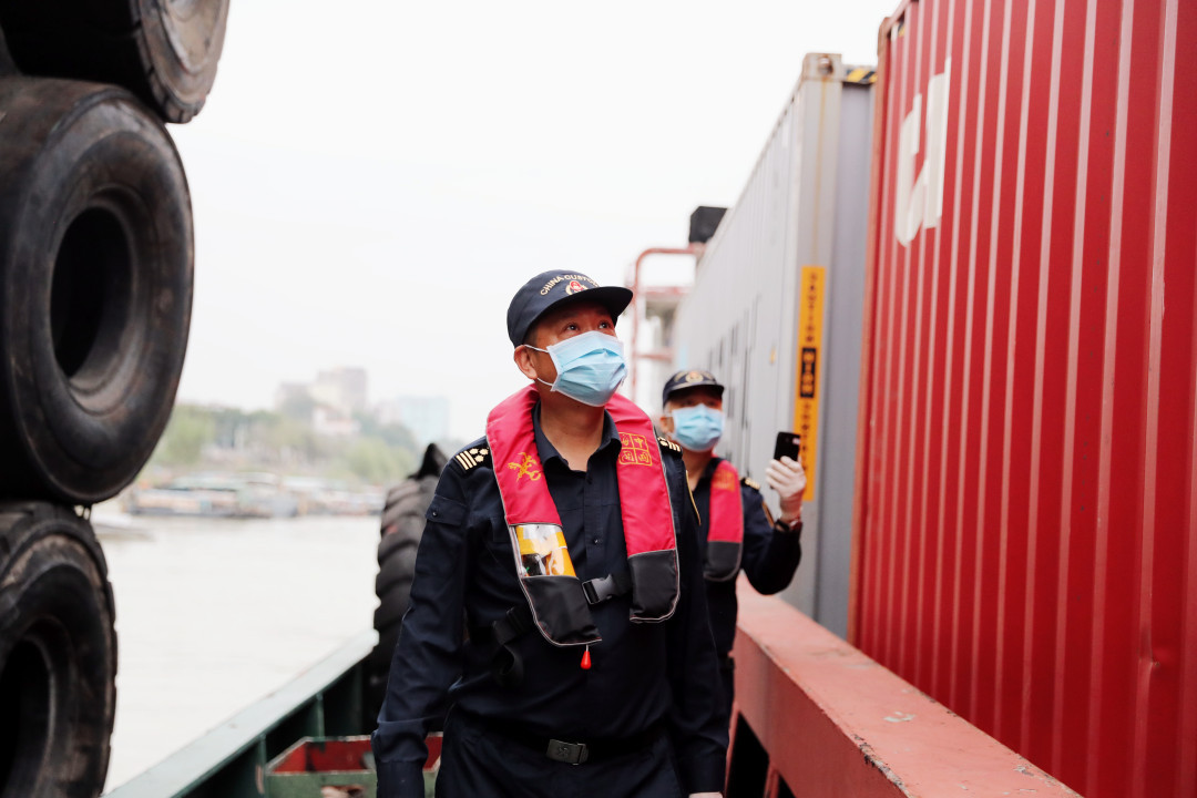 图说:邝塑雄(左)和同事对进境船舶进行登临检查