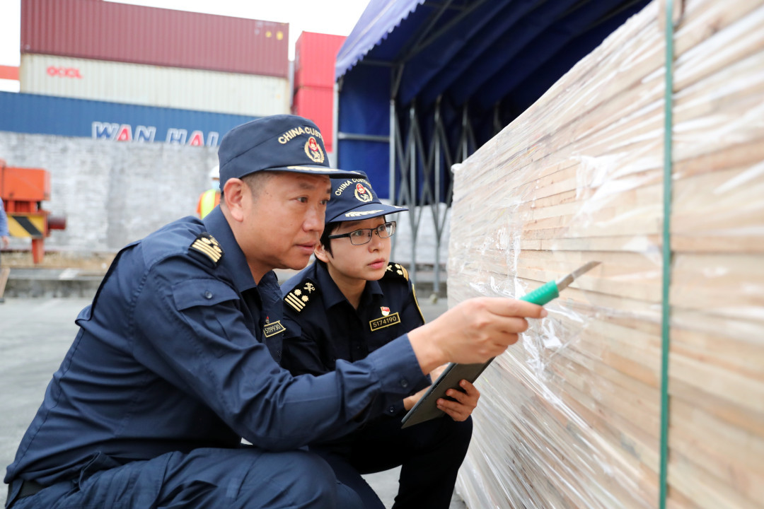 图说:邝塑雄(左)和同事对进口木方进行查验