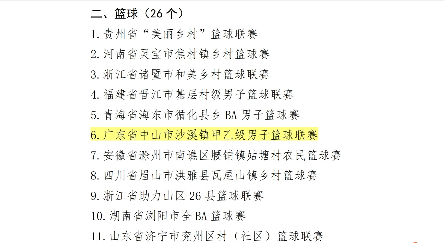 广东省中山市沙溪镇甲乙级男子篮球联赛入选首批群众篮球精品赛事。