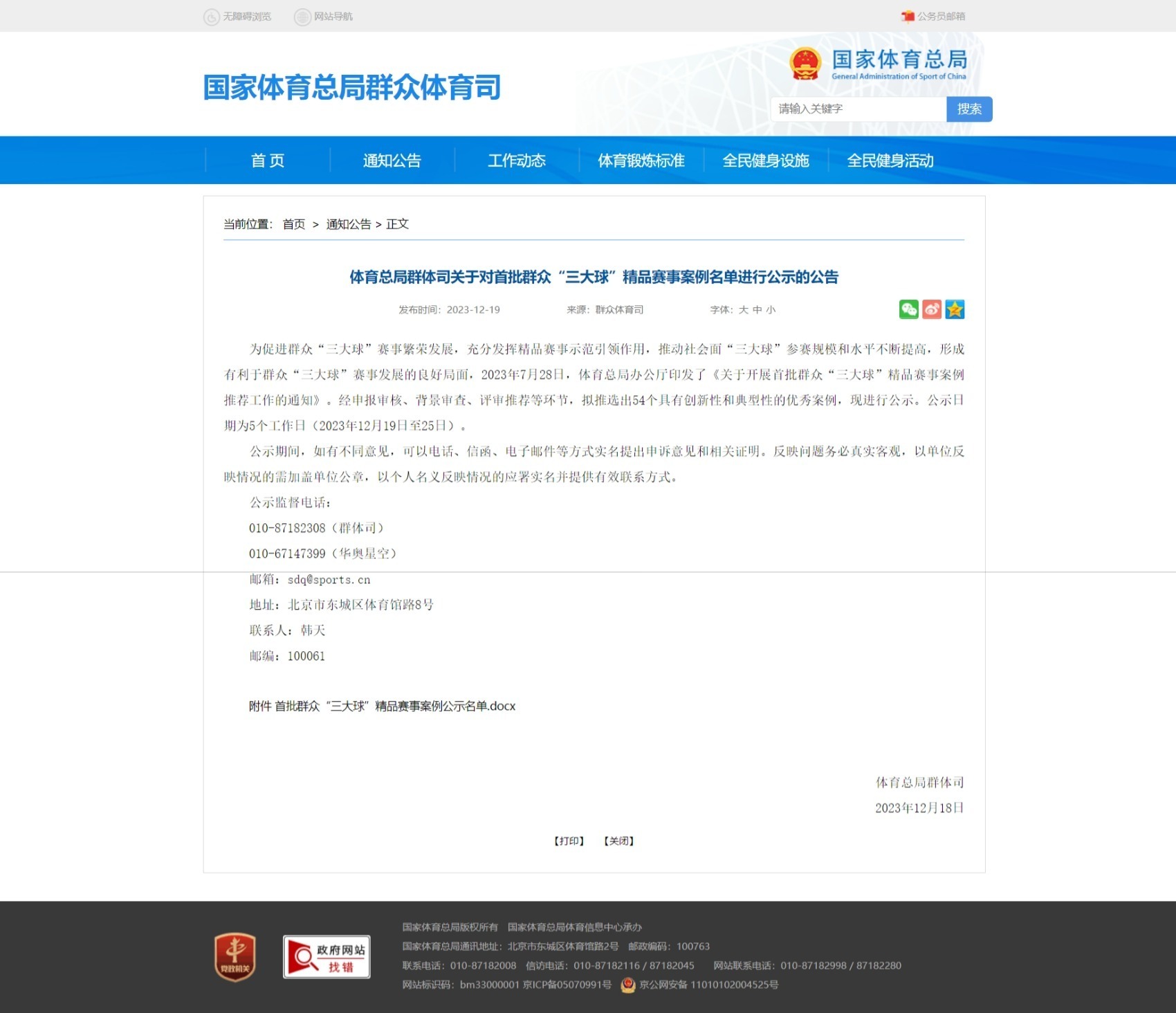 12月18日,国家体育总局群体司发布《体育总局群体司关于对首批群众“三大球”精品赛事案例名单进行公示的公告》。