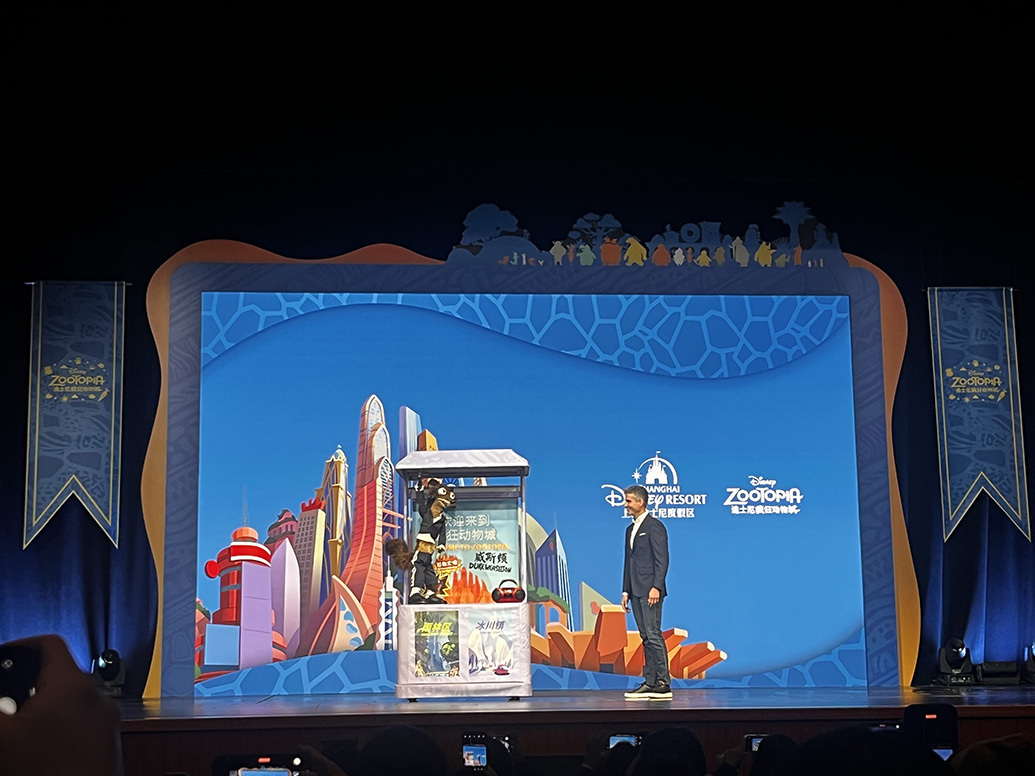 在开幕庆典后的媒体分享会上,当戴明哲向来自全球各地的媒体嘉宾分享公司在“疯狂动物城”开幕之际的最新愿景时,片中的“威斯顿公爵”突然现身。这只电影里巧舌如簧的黄鼬展现了华特迪士尼幻想工程师如何运用尖端前沿的机械人偶技术,将迪士尼故事和角色栩栩如生地呈现在游客面前。