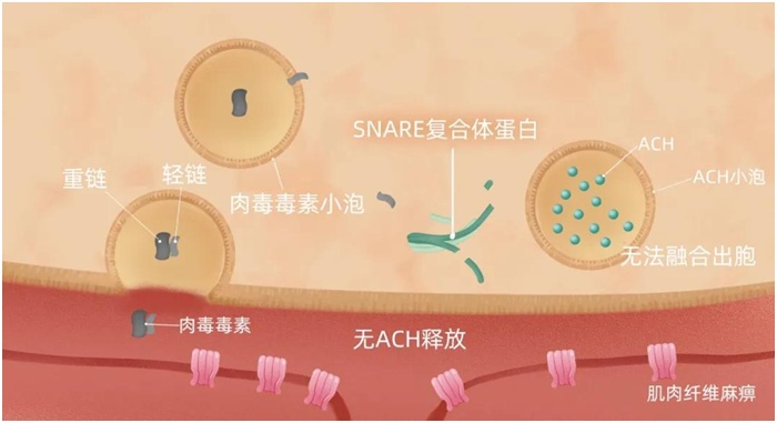肉毒毒素侵入人体后,与神经元膜上的受体结合,通过胞吞作用形成小泡进入神经元。在神经元里,毒素的轻链断开、从小泡中释放出来,攻击SNARE复合体蛋白,使其无法协助乙酰胆碱(ACH)从神经元中释放出来,肌肉细胞上的ACH受体无法接收信号,肌肉不会收缩,处于松弛状态,表现出肌肉乏力症状。