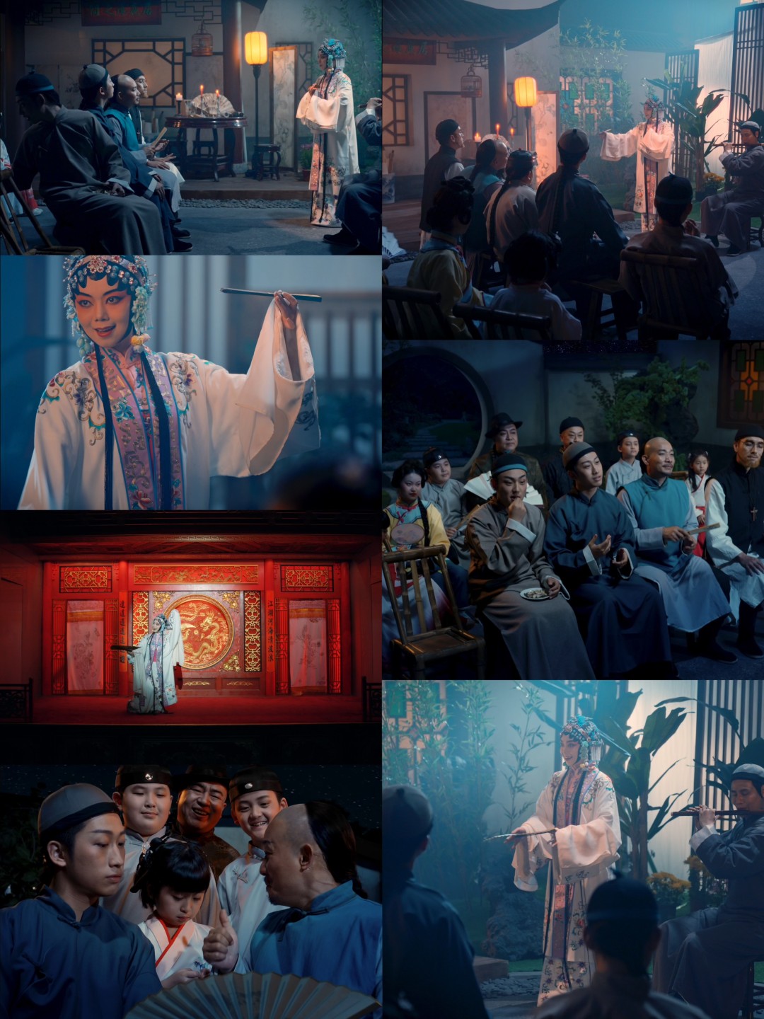 亭子、门廊、满洲窗、“十香园”的白墙灰瓦、芭蕉叶……剧中对“十香园”和岭南庭院的视觉审美符号进行提取、重组,更好地捕捉到岭南文化的精髓。在视听语言的设计上,主创则参考了一些邵氏老电影,尤其是在棚内拍摄的戏曲片,同时加入了卓别林电影的经典元素,为片子在视听语言方面增添更多复古又幽默的色彩。