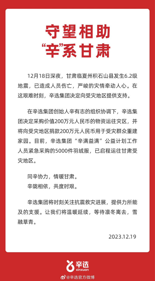 据辛选集团官方微博消息,12月19日,辛选集团决定采购价值200万元人民币的物资运往灾区,并将向受灾地区捐款200万元人民币用于受灾群众重建家园。目前,辛选集团“辛满益满”公益计划工作人员紧急采购的5000件羽绒服,已启程运往甘肃受灾地区。