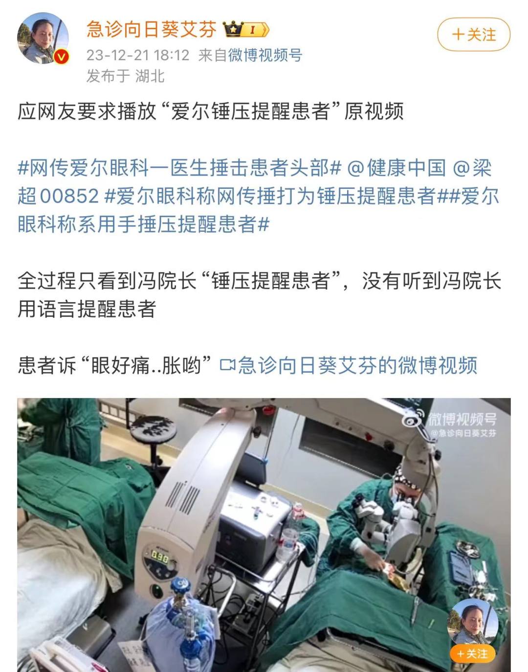 12月21日,“贵港爱尔眼科”就此事发布了声明。声明称,近日,武汉中心医院急诊科主任艾某在网络发微博称“爱尔眼科医生在手术台上拳击患者头部”,并将手术室视频发布到网上,引发舆论关注。经调查了解,此事发生于2019年12月12日。患者覃某,诊断左眼白内障,左眼晶体脱位,术前视力:光感。患者诊断明确,行左眼晶状体摘除(非正常晶体)+眼前节玻璃体切割手术。手术过程中,由于是局部麻醉,患者有手术不耐受,伸手向上试图摸眼部,眼部附近为手术无菌区域,一旦触摸将可能造成感染,且手术正在进行中,医生为避免发生危险,情急之中用手迅速锤压提醒患者,不存在伤害患者的动机和行为。术后患者曾有误解,经医生与患者和家属解释,双方已消除误会、达成谅解。