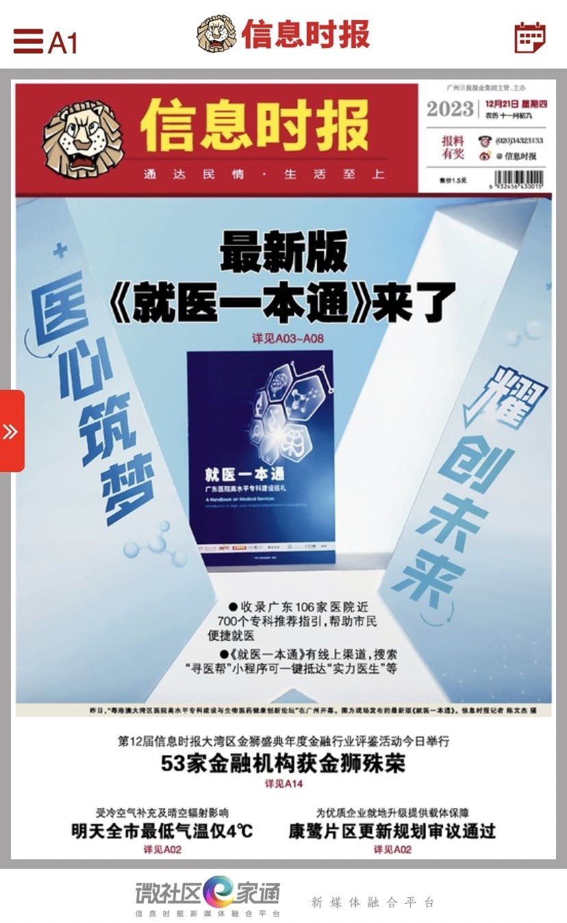 过去六年,广州日报报业集团旗下广州日报健康有约、信息时报以及广州艾力彼携手已携手发布了四本的《就医一本通》,在市民心中深有群众基础,被喻为居家必备的一本就医宝典。12月20日,最新版本《就医一本通》发布,该书集结了广东106家医院近七百个专科信息,包括最强专科579个,提名专科118个。力求为公众提供一份公正客观,权威实用的就医指引。通过广州日报健康有约微信公众号、广州日报融媒矩阵,以及信息时报官方微信、信息时报微社区e家通145条镇街的公众号矩阵,均可便捷获得这一份最新版的医疗服务。