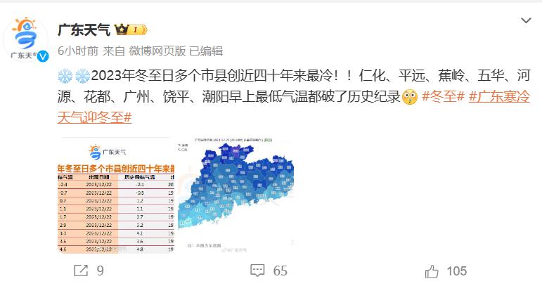 受冷空气补充及辐射降温影响,今天早晨广东多个市县创2023年下半年最低温,这也是本次寒潮过程的最低气温。气象部门表示,这波最冷的时候基本已经过去,广东寒潮完成了2023年终任务。