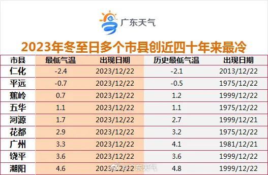 12月23日,南部沿海市县多云间晴天,其余市县晴到多云。最低气温:粤北市县零下2℃~3℃,高寒山区零下7℃~零下2℃;南部沿海市县7~11℃,其余市县4~7℃,中北部市县有冰(霜)冻。